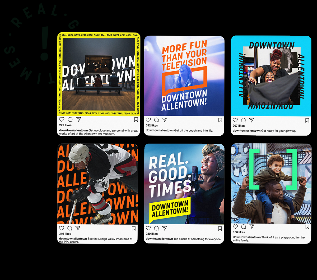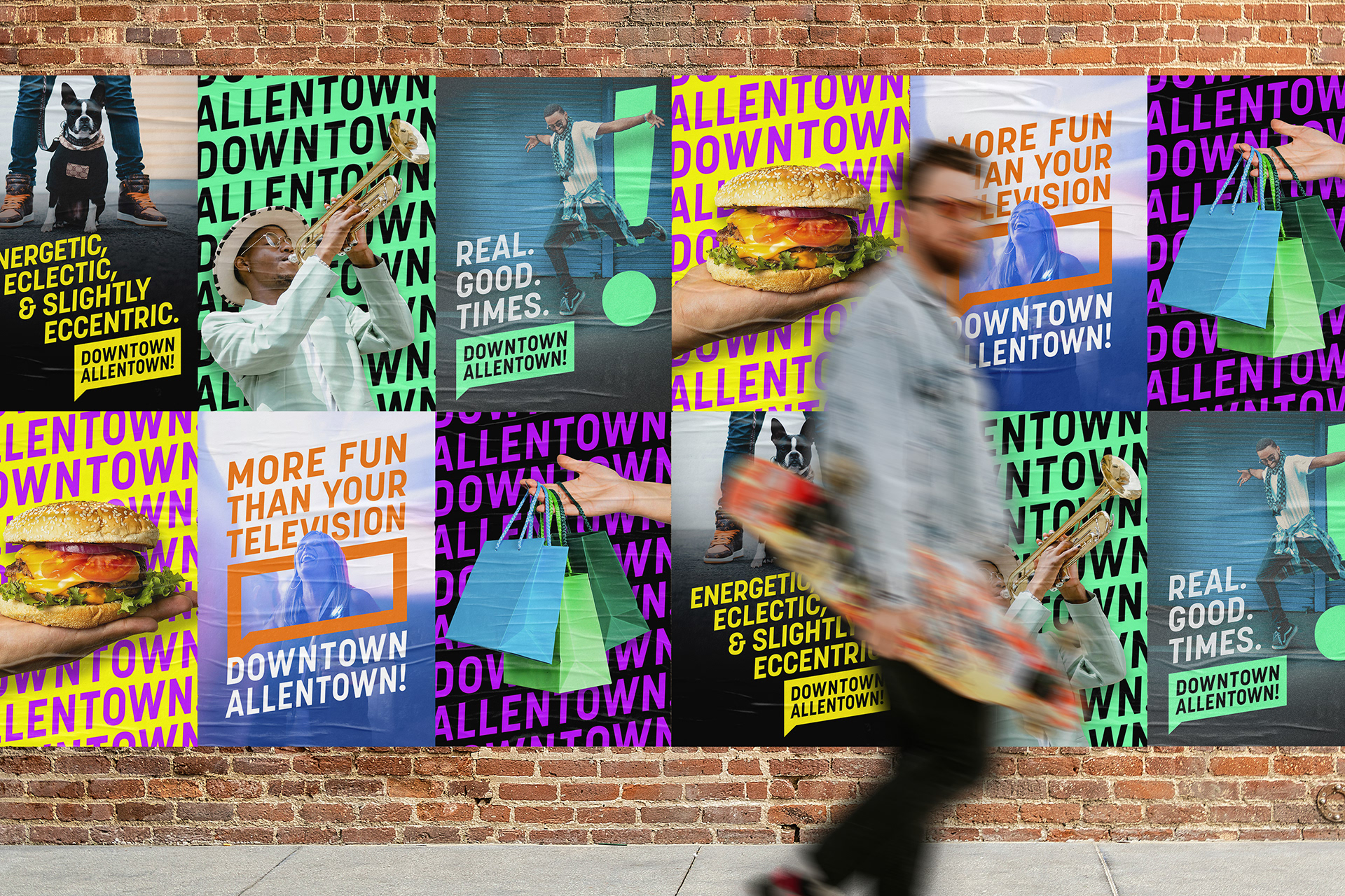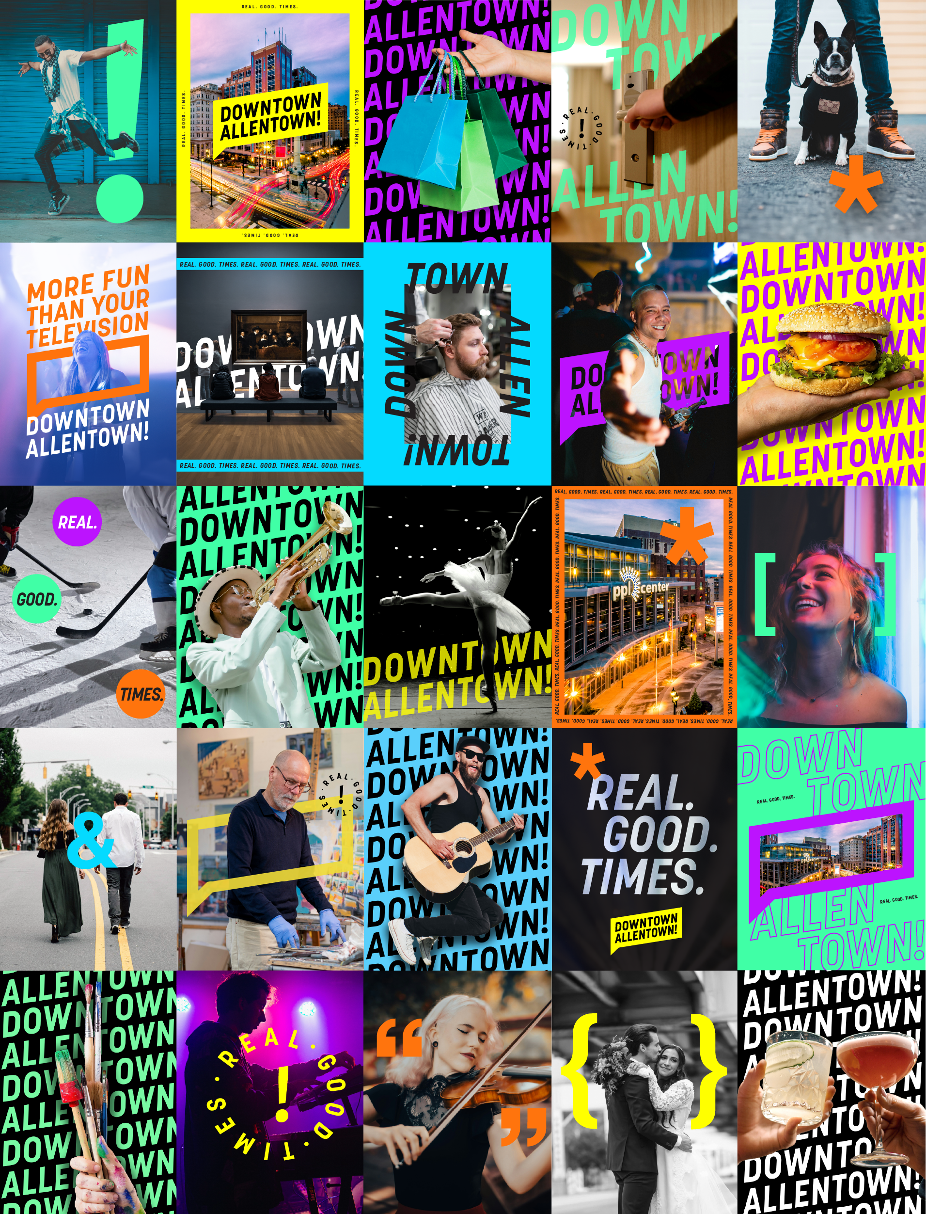 Allentown is the third largest city in Pennsylvania and features a bustling, urban center city with over 120,000 residents. With the formation of a new downtown planning and tourism organization, the community hoped to share its vibrant downtown with new visitors and businesses alike. The organization chose to rebrand the area, with the tagline “Real. Good. Times.” as a testament to the city’s authenticity and excitement. A new logo, reminiscent of both a speech bubble and a GPS pin on a map symbolizes the excitement and exuberance of the downtown district. Punctuation marks are used as an overall graphic concept (!, “”, &, [], etc.) to capture both the motion and emotion individuals experience living their lives in Downtown Allentown. Bold typography and colors are predominant in the visual identity to showcase the spirit of vibrance and exhilaration of the lively city.