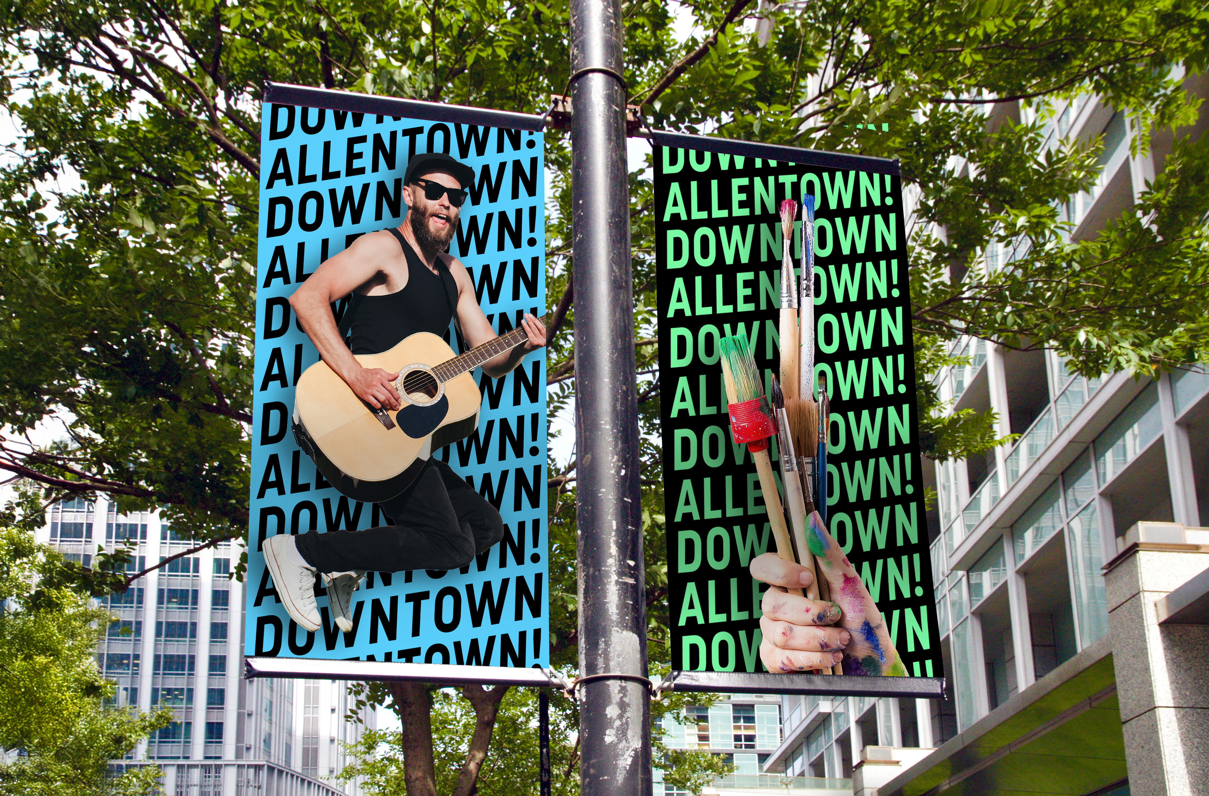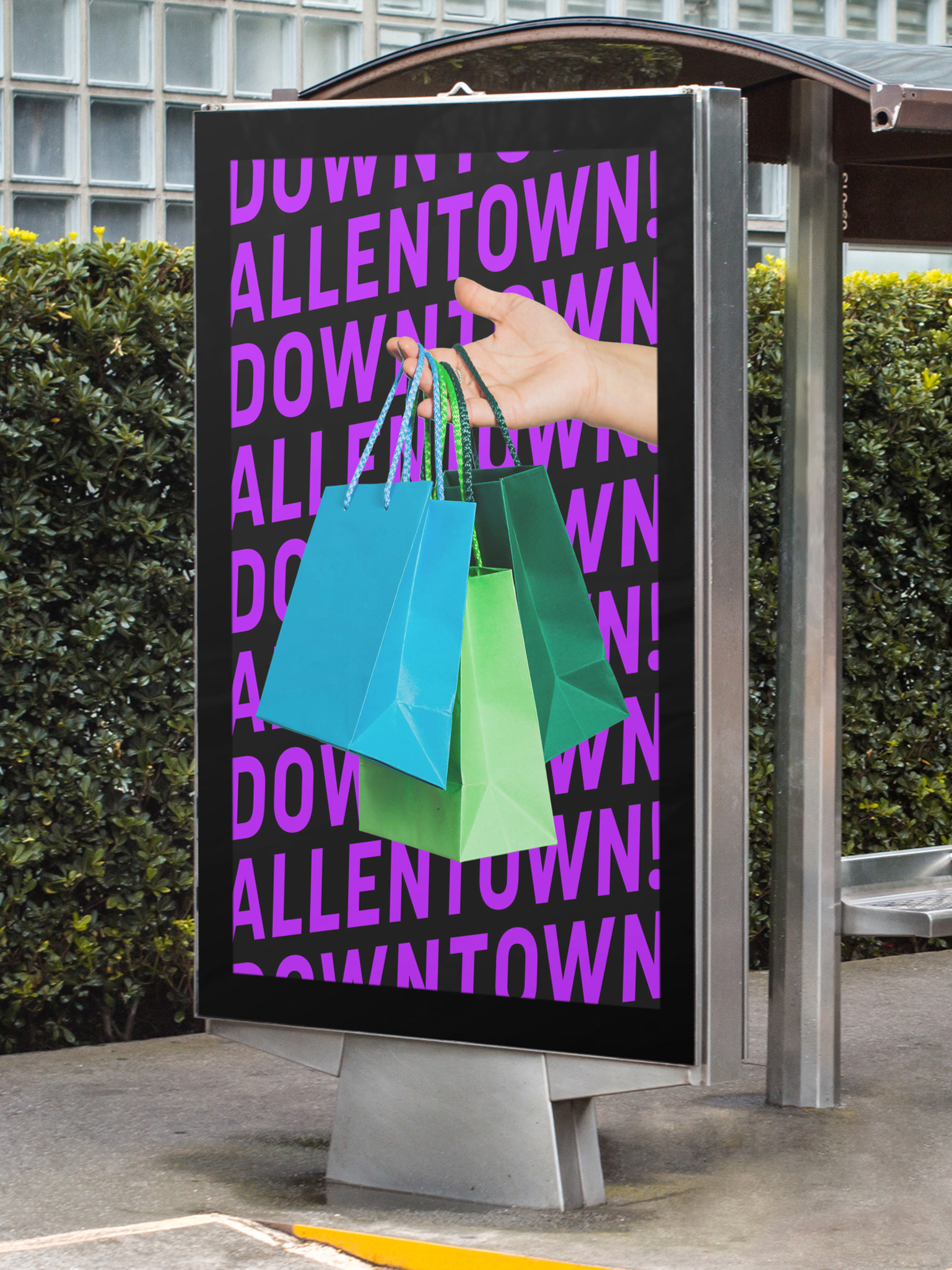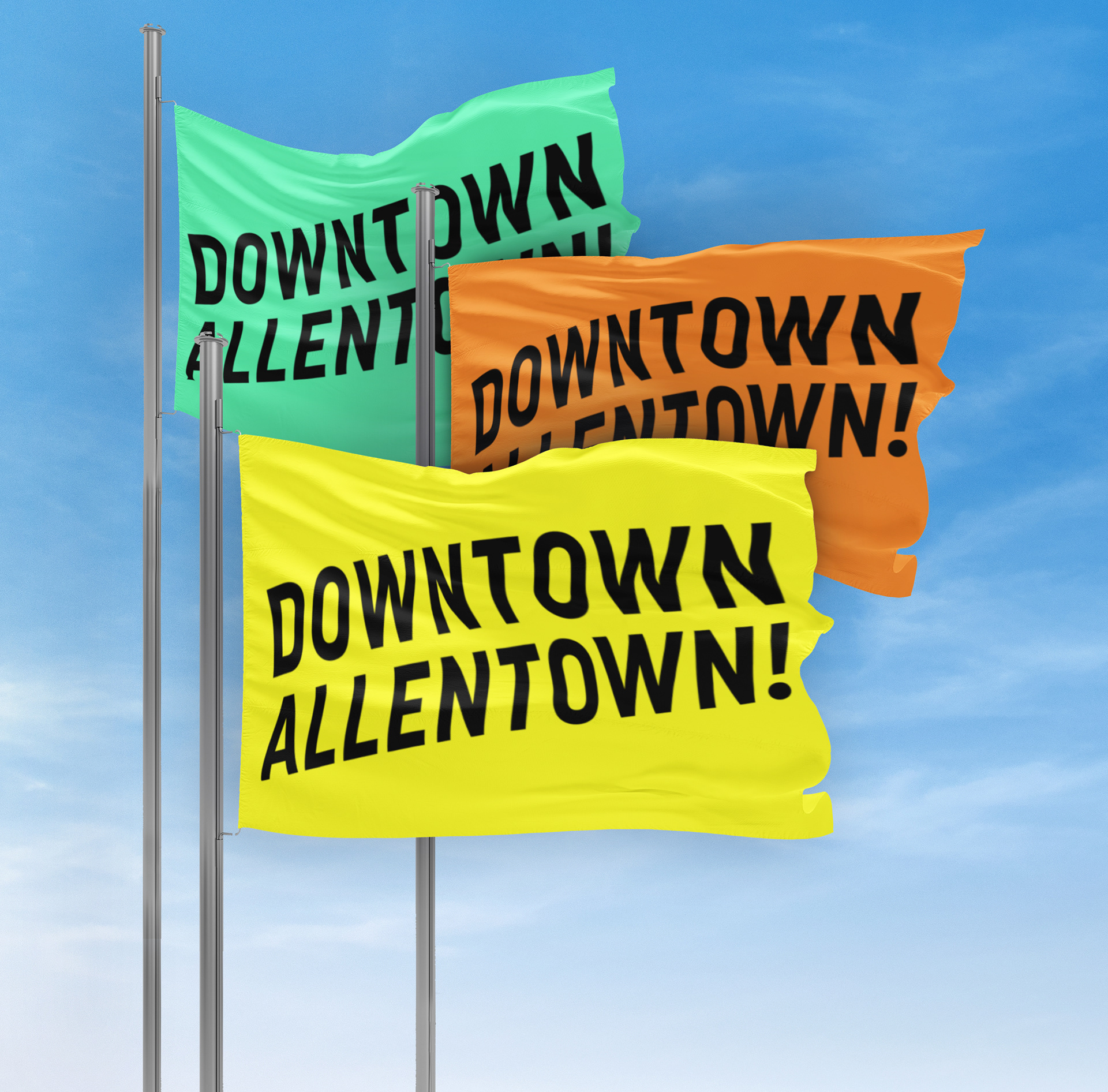 Allentown is the third largest city in Pennsylvania and features a bustling, urban center city with over 120,000 residents. With the formation of a new downtown planning and tourism organization, the community hoped to share its vibrant downtown with new visitors and businesses alike. The organization chose to rebrand the area, with the tagline “Real. Good. Times.” as a testament to the city’s authenticity and excitement. A new logo, reminiscent of both a speech bubble and a GPS pin on a map symbolizes the excitement and exuberance of the downtown district. Punctuation marks are used as an overall graphic concept (!, “”, &, [], etc.) to capture both the motion and emotion individuals experience living their lives in Downtown Allentown. Bold typography and colors are predominant in the visual identity to showcase the spirit of vibrance and exhilaration of the lively city.